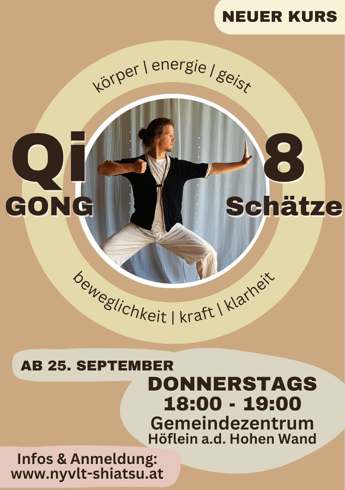 In diesem Kurs wird in 10 Einheiten die Acht-Schätze-Form erarbeitet, geübt und erläutert, zudem werden die Grundlagen & Grundsätze von Qi Gong (Atmung, Haltung, Yin & Yang, …) praktisch und theoretisch vermittelt.